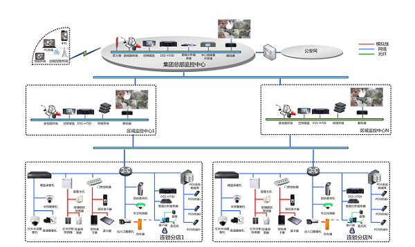 級管理架構(gòu):針對連鎖商超行業(yè)的公司組織架構(gòu),方案采用總部、分公司、門店三級管理架構(gòu),門店部署監(jiān)控、報警、門禁等系統(tǒng)實現(xiàn)數(shù)據(jù)采集與本地管理業(yè)務(wù),集團(tuán)總部與分公司部署管理平臺與監(jiān)控中心,總部、分公司與門店通過專線、ADSL或VPN等方式實現(xiàn)互聯(lián)互通。
